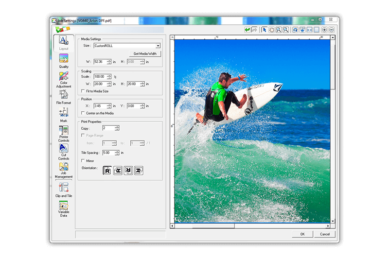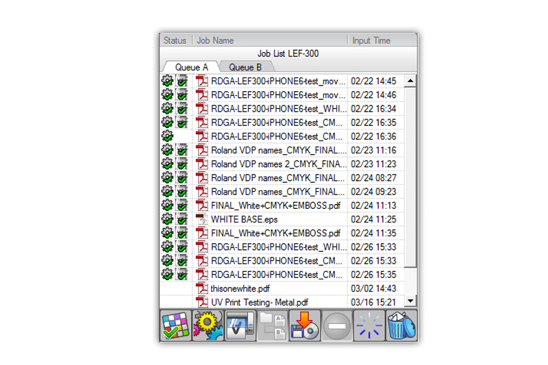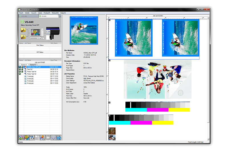 VersaWorks Dual专为轻松打印生产而设计,拥有简单的拖放界面,可让用户直接从桌面文件夹向打印队列快速添加作业。点击用户友好图标打开打印机设置,作业预览和其他功能,实现快速,高效的文件设置。
